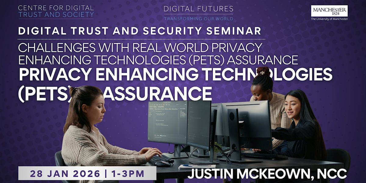 The Centre for Digital Trust and Society organises the DTS Guest Seminar Series and is a focal point for research across the University of Manchester that explores aspects of trust and security in our digital world. The Centre is part of Digital Futures, a highly interdisciplinary network which operates across the whole range of the University of Manchester's digital research.
