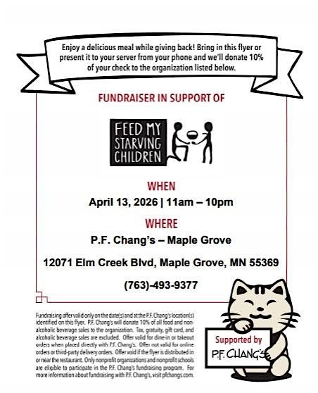 Come, join us, and help give back to a local charity. One day, only 10% of your dining experience will be donated to Feed My Starving Children. Just show this to your server or bartender, and we will add the promo code with no additional cost to you!