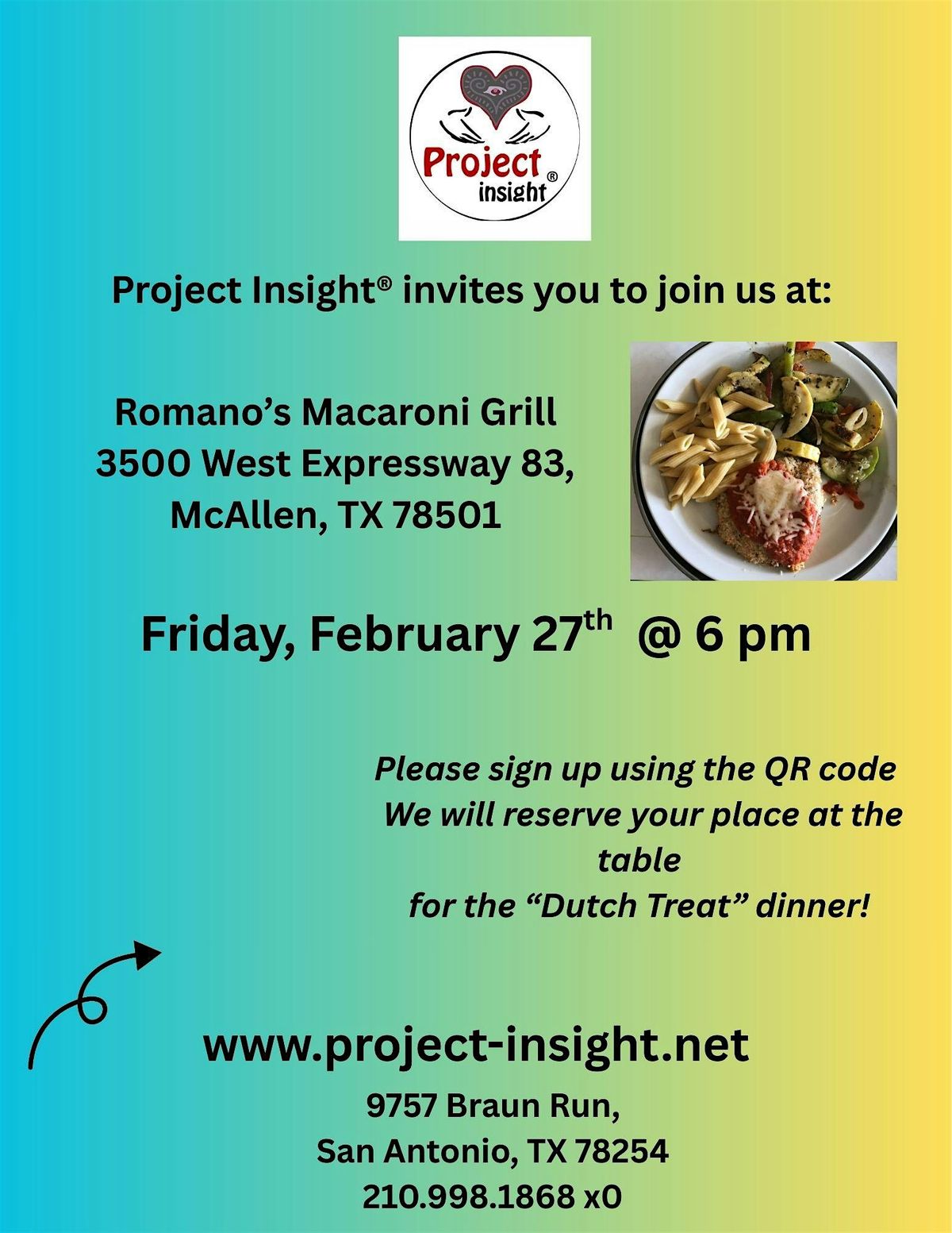 Join us for a delicious evening filled with pasta, laughter, and Project Insight®'s good company at Romano's Macaroni Grill!