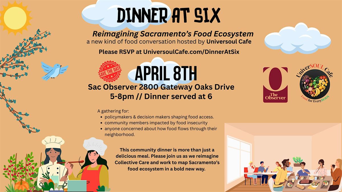 Dinner at Six is more than just a delicious meal. It’s a new kind of food conversation rooted in dignity, choice, and collective care.Join us for a community dinner where policymakers, community members, and neighbors are invited to reimagine how food flows through Sacramento. This gathering is about listening, sharing lived experience, and mapping a bold, people-centered food ecosystem that works for everyone.