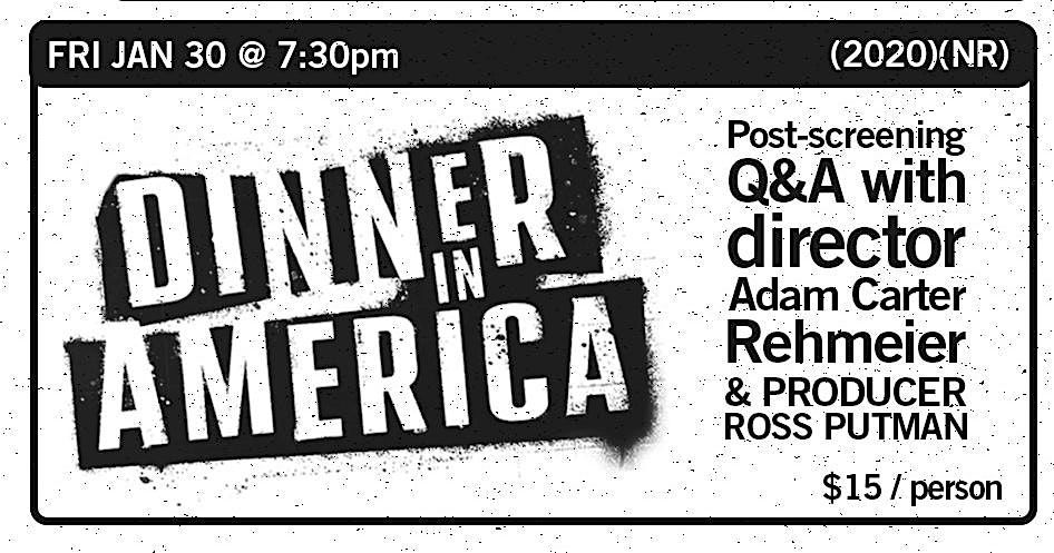 DINNER IN AMERICA starts on Friday, January 30, 2026 at 7:30 pm. The Q&A with director Adam Carter Rehmeier and producer Ross Putman immediately after the conclusion of the screening.