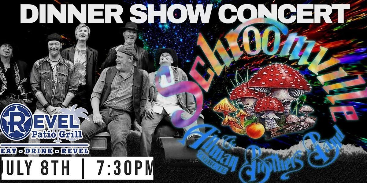 Get ready to experience the soulful, twin-guitar harmony and deep southern grooves of the legendary Allman Brothers Band! Join us at The Revel Patio Grill for an evening with Schroomville. Theyβll be bringing the authentic "Eat a Peach" energy to the stage, performing all your favorites from Ramblin' Man to the hypnotic jams of In Memory of Elizabeth Reed.