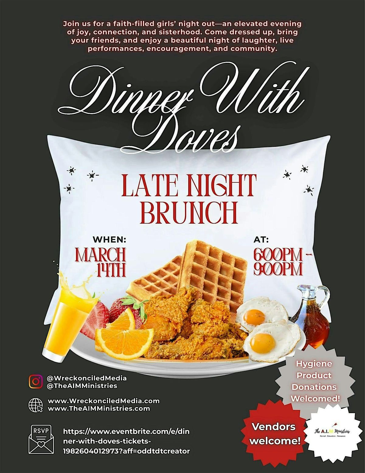 Grab your girls and come out to Dinner with Doves—a joy-filled, faith-centered night for women all about connection, laughter, worship, and sisterhood 🤍 Hosted by Wreckonciled Media and The AIM Ministries, this night is packed with live music, games, giveaways, a panel, photo booths, goodie bags, and all the good vibes. And yes—we’re serving brunch at night… because who doesn’t want a hot, buttery waffle before bed? 😄 Come be encouraged, come be yourself, and come have FUN. You do not want to miss this!