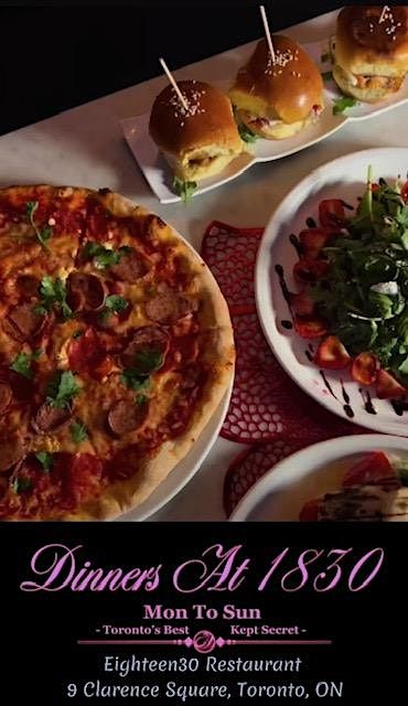 JOIN US AT EIGHTEEN 30 RESTAURANT...MONDAY TO SUNDAY 5PM TO 10PMDINNERS AT 18305pm to 11pmEighteen30 Toronto9 Clarence SquareToronto, OntarioOne Block South Of King St. W. At Spadina AveToronto's Upscale Cocktail Bar & RestaurantPrivate Dining | Special Events | Live MusicSEE MENU BELOW