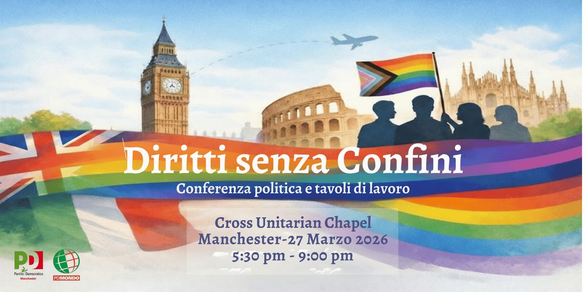 Un evento partecipativo dedicato ai diritti LGBTQIA+ delle persone italiane in Italia e all’estero. L’iniziativa nasce dal lavoro collettivo del gruppo Diritti Civili del PD Manchester, in dialogo con i Circoli del PD Mondo, associazioni LGBTQIA+, amministratrici e amministratori locali, attiviste e attivisti.