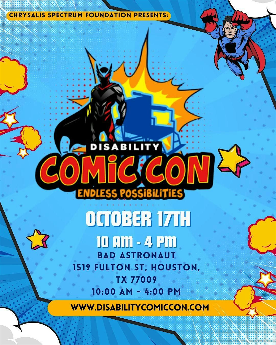 Every ticket purchased directly supports our mission. Proceeds from Disability Comic Con will help fund access for individuals with visible or invisible disabilities to attend events, outings, concerts, and other meaningful experiences through Chrysalis Spectrum Foundation, a 501(c)(3) nonprofit organization based in Houston, Texas.