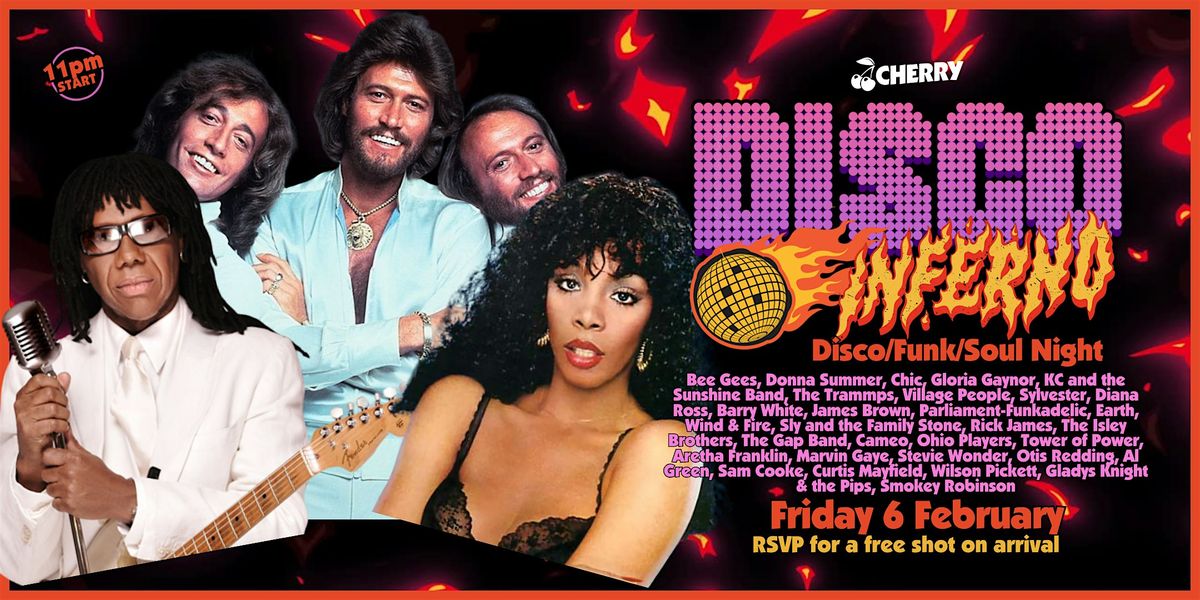 Boogie down, babies! Cherry Bar is turning into a soul train time machine for one night only – welcome to DISCO INFERNO. All killer, no filler – just pure disco, soul & funk fire all night long.