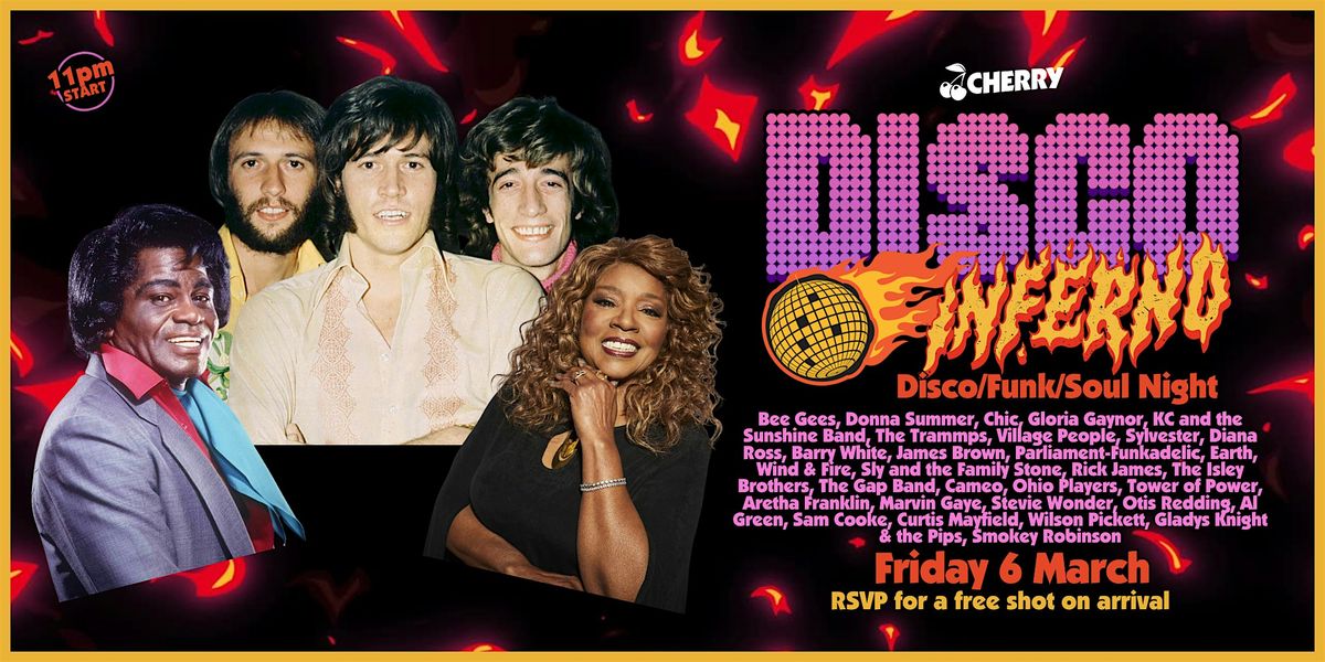 Boogie down, babies! Cherry Bar is turning into a soul train time machine for one night only – welcome to DISCO INFERNO. All killer, no filler – just pure disco, soul & funk fire all night long.