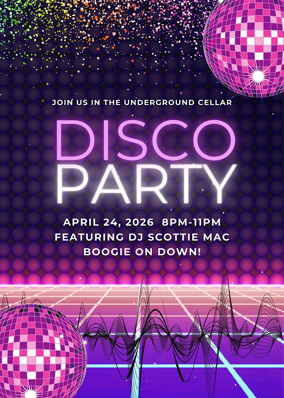 Get your groove on! Disco vibes all night with DJ Scottie Mac spinning the ultimate dance floor hits. Doors open at 5 pm, disco starts at 9!