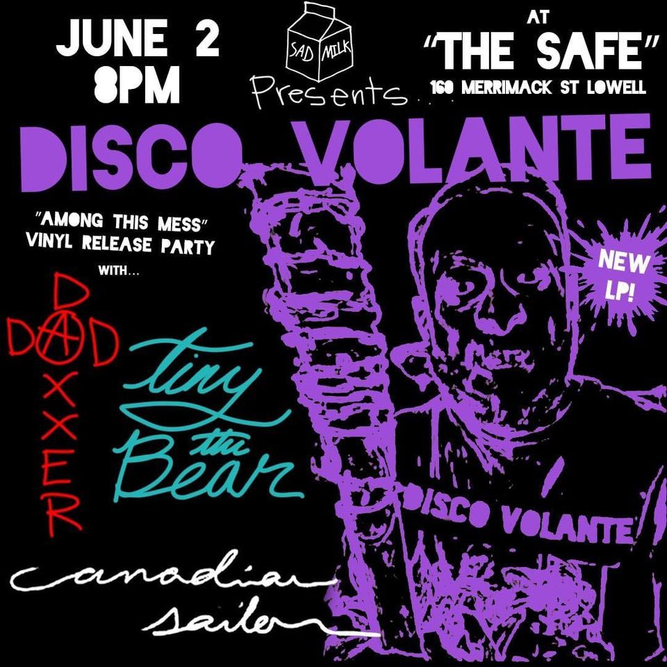 Come out to Lowell this Friday for Disco Volantes vinyl release show featuring our friends Canadian Sailor, Dad Doxxxer, and Tiny the Bear presented by Sad Milk!Doors @ 8pm