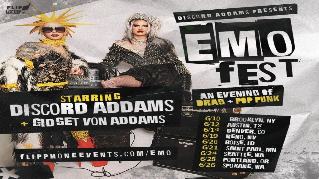 EMO FEST: An Evening of Drag + Pop Punk by Discord Addams EmoFest is a high energy night celebrating all things 2000s pop punk, hosted by Discord Addams from RuPaul's Drag Race alongside Gidget Von Addams. Get ready for interactive games, Emo Karaoke, exciting prizes, and a pop punk costume contest that brings your favorite angsty era back to life. Its all emo, all night, so grab your eyeliner, lace up your Converse, and scream your heart out on the dance floor!