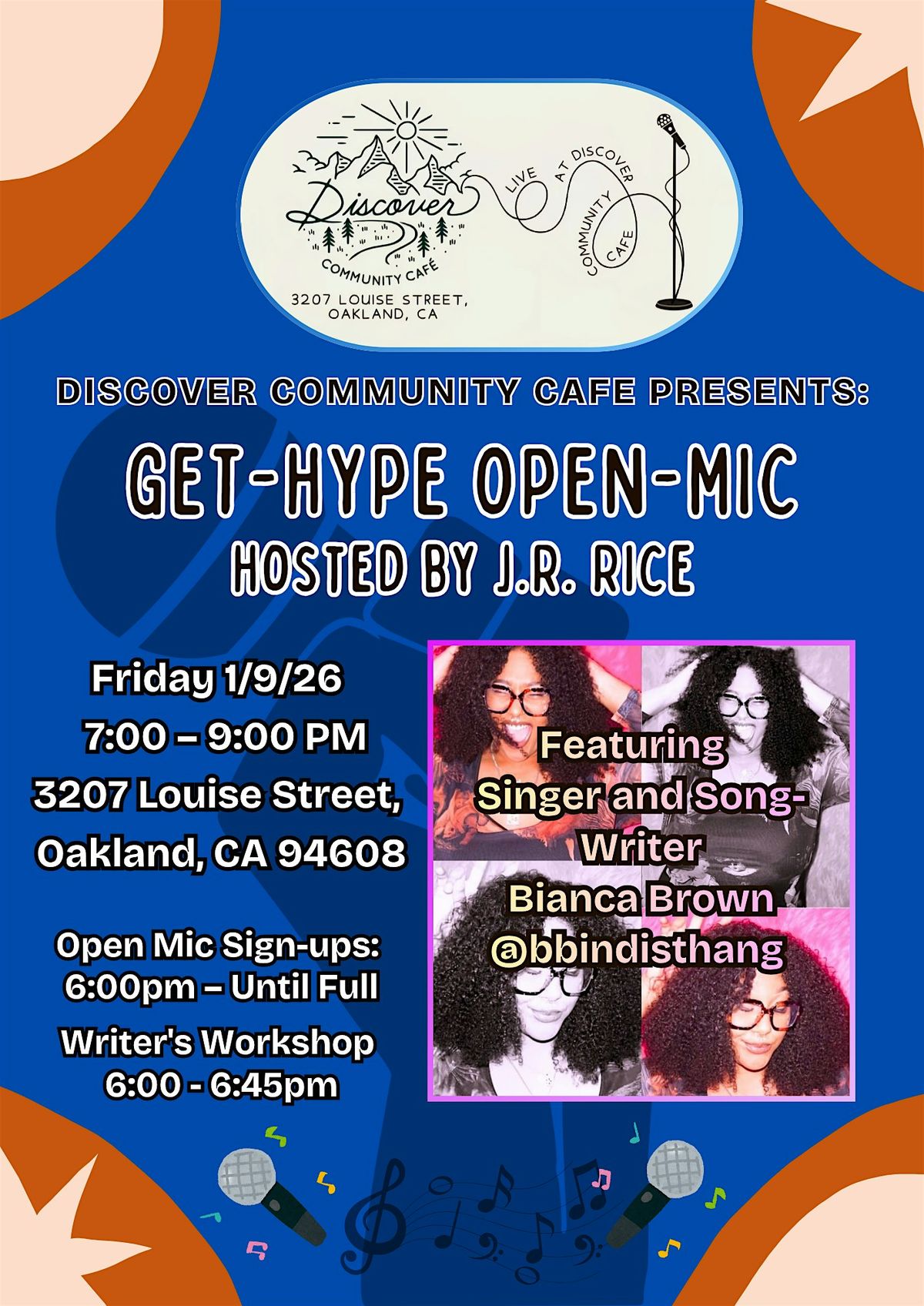 Join us for Discover Community Cafe Presents: Get-Hype Open-Mic 1ST SHOW OF 2026, hosted by Oakland raised author and poet, J.R. Rice. Come through to this FREE EVENT at 3207 Louise Street, Oakland, CA 94608 on Friday January 9th, 2025 from 6:00-9pm for an open mic like no other.