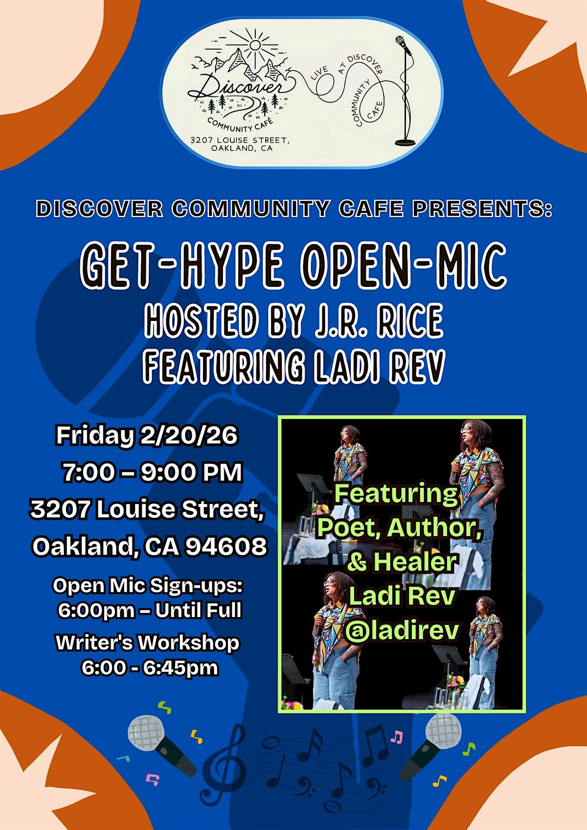 Join us for @Discover_Community_Cafe Presents: Get-Hype Open-Mic hosted by Oakland raised author and poet, @imjrice. Come through to this FREE EVENT at 3207 Louise Street, Oakland, CA 94608 on Friday February 20th, 2026 from 6:00-9pm for an open mic like no other. Whether you're a poet, musician, comedian, or storyteller, here is your opportunity to share your work to the world.
