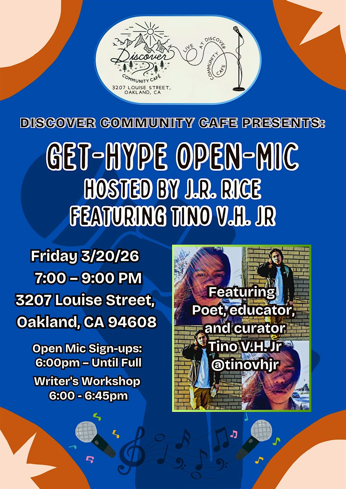 Join us for @Discover_Community_Cafe Presents: Get-Hype Open-Mic hosted by Oakland raised author and poet, @imjrice. Come through to this FREE EVENT at 3207 Louise Street, Oakland, CA 94608 on Friday March 20th, 2026 from 6:00-9pm for an open mic like no other. Whether you're a poet, musician, comedian, or storyteller, here is your opportunity to share your work to the world.