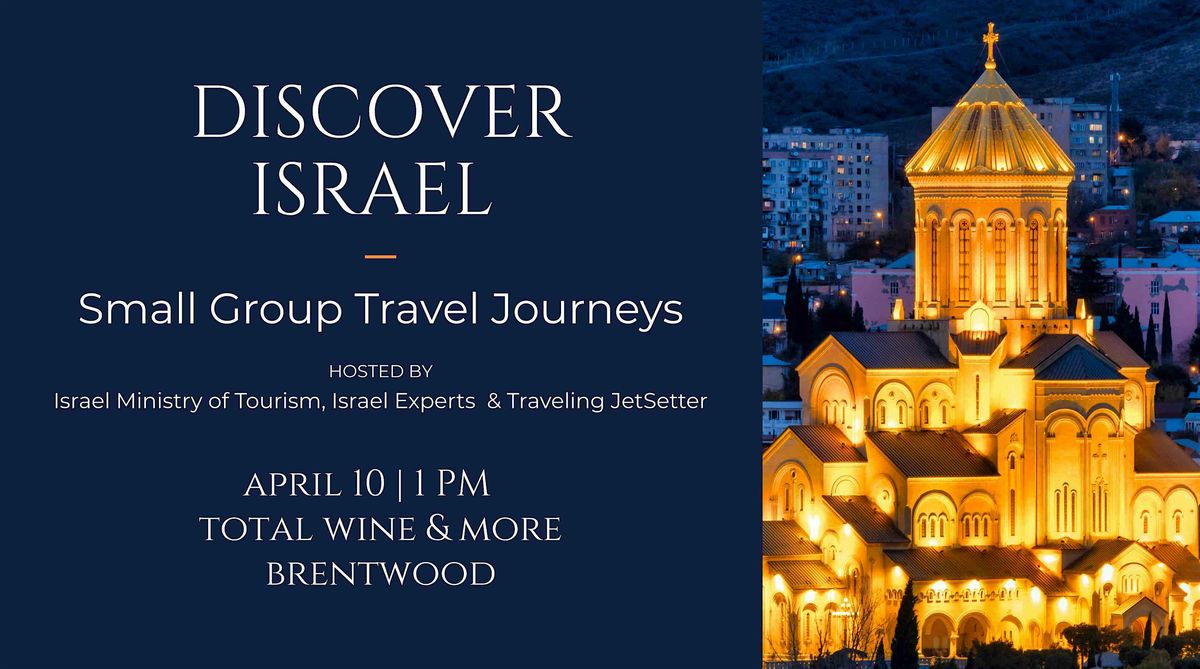 Join us at Total Wine & More on April 10, 2026 at 1:00 PM (Central Time) for casual and informative meetup! Get the inside scoop on amazing customized small group travel journeys to Israel and ask all your questions. We'll cover country insights, safety, travel styles, customizing trips for your groups or groups to join and more! Whether you're a seasoned explorer or just curious, this is the perfect chance to discover Israel adventures in a relaxed setting with the experts!