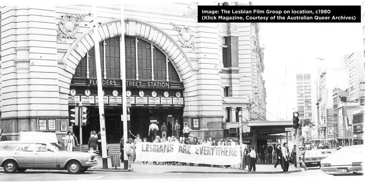 Image: Black and white photo of a large group of people in front of Flinders Street Station holding a banner saying LESBIANS ARE EVERYWHERE. Image credit: The Lesbian Film Group on location, c1980. (Klick Magazine, Courtesy of the Australian Queer Archives)