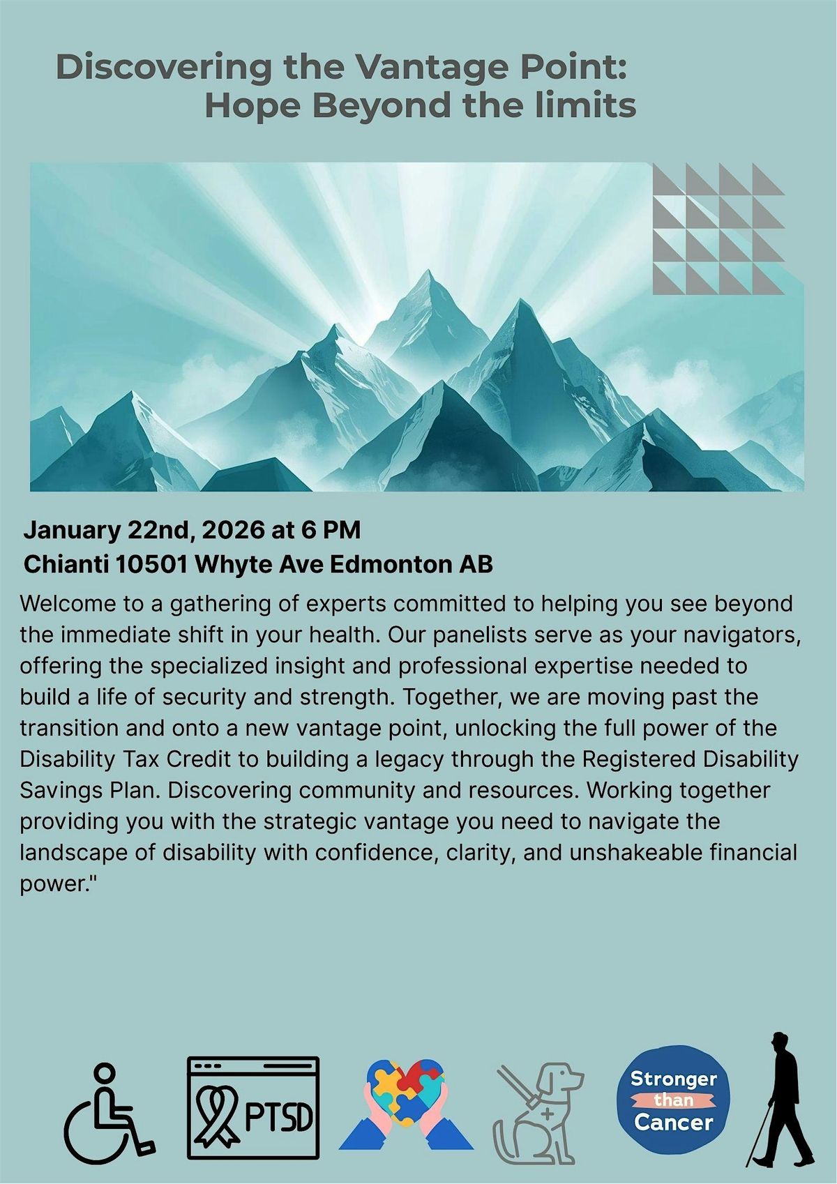 Welcome to a gathering of experts commitied to helping your see beyond the shift in your health. Our panelists serve as your navigators, offering the specialized insight and professional expertise needed to build a life of security and strength. Together, we are moving past the transition and onto a new vantage point, unlocking the full power of the Disability Tax Cred to building a legacy through Registered Disability Savings Plan. Discovering community and resources. Working together providing you with the strategic vantage you need to navigated the landscape of disability with confidence, clarity and unshakable financial power, and identity shift.
