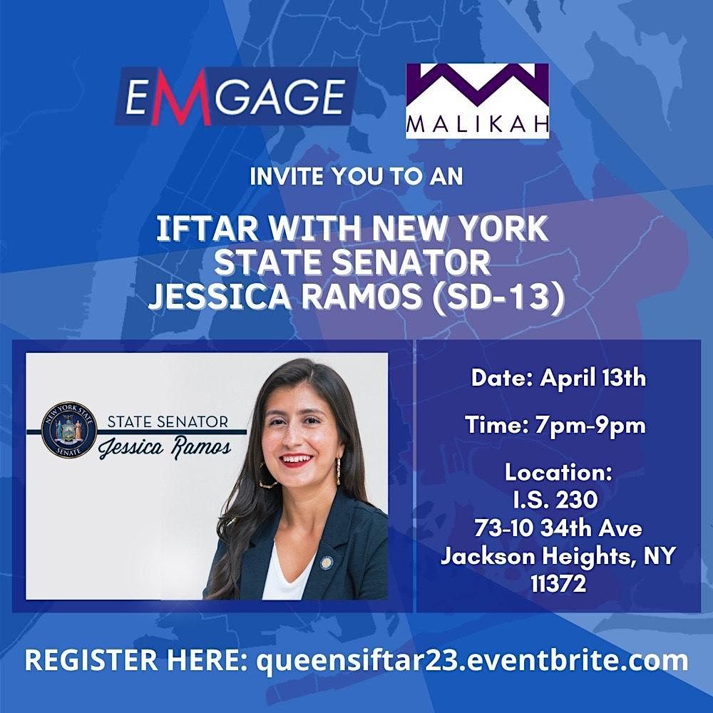 Ramadan Mubarak! We invite you to join the Office of Senator Jessica Ramos, Malikah, and Emgage for a #District13 Community Iftar in Jackson Heights. This event is open to all members of the community and their families.