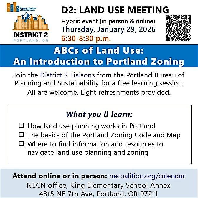 Join the District 2 Liaisons from the Portland Bureau of Planning and Sustainability for a free learning session.
