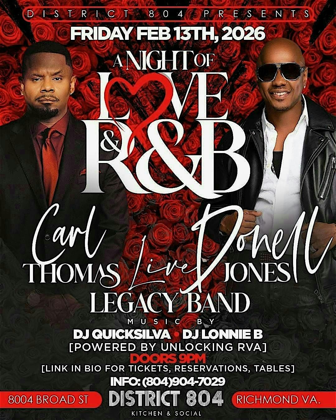 Get ready for a soulful evening at District 804! Join us on Friday, February 13, 2026 for a night of Love and R&B with special guests Donell Jones and Carl Thomas! Sounds by Legacy Band, DJ QUICKSILVA, DJ Lonnie B and Hosted by Unlocking RVA. Don't miss out on this unforgettable experience!
