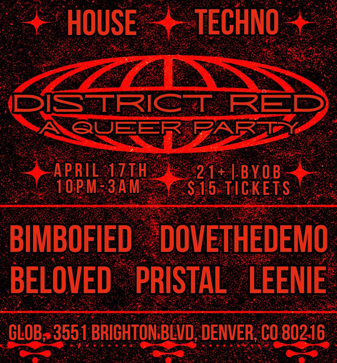 A house music and techno based party at the Glob warehouse in Denver, CO on April 17th from 10pm-3am! $10 - $15 tickets available on sapphiccollective.com (please pay the full price if you can - we like to make sure everyone involved gets paid WELL)