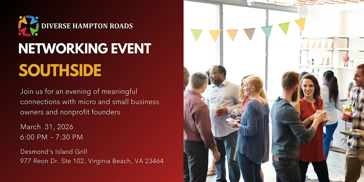 Join us for the Diverse Hampton Roads Southside Networking Event on March 31, 2026, at 6:00 PM at Desmond's Island Soul Grill.