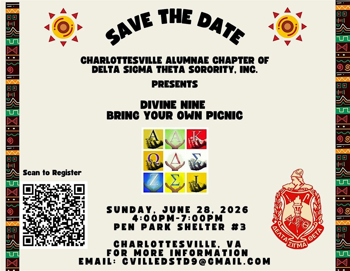 Join the Charlottesville Alumnae Chapter of Delta Sigma Theta Sorority, Inc. for an afternoon of fellowship and fun at the second annual Divine 9 Bring Your Own Picnic. There will be food, networking, games, and stroll-off! Hot dogs and hamburgers will be provided by the hosts. If you or your organization would like to donate, or if there are questions, please contact [email protected] .