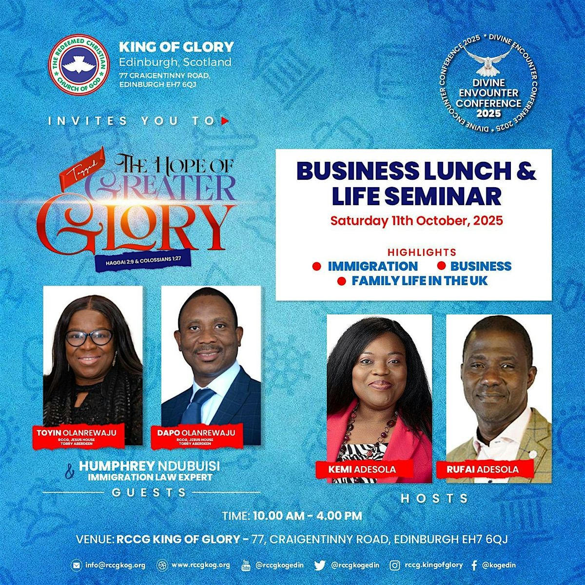 Hear from an exceptional lineup of speakers: Pastor Toyin Olanrewaju, Pastor Dapo Olanrewaju, Barrister Humphrey Ndubuisi (Immigration Law Expert), and Hosts Pastor Rufai & Pastor Kemi Adesola.