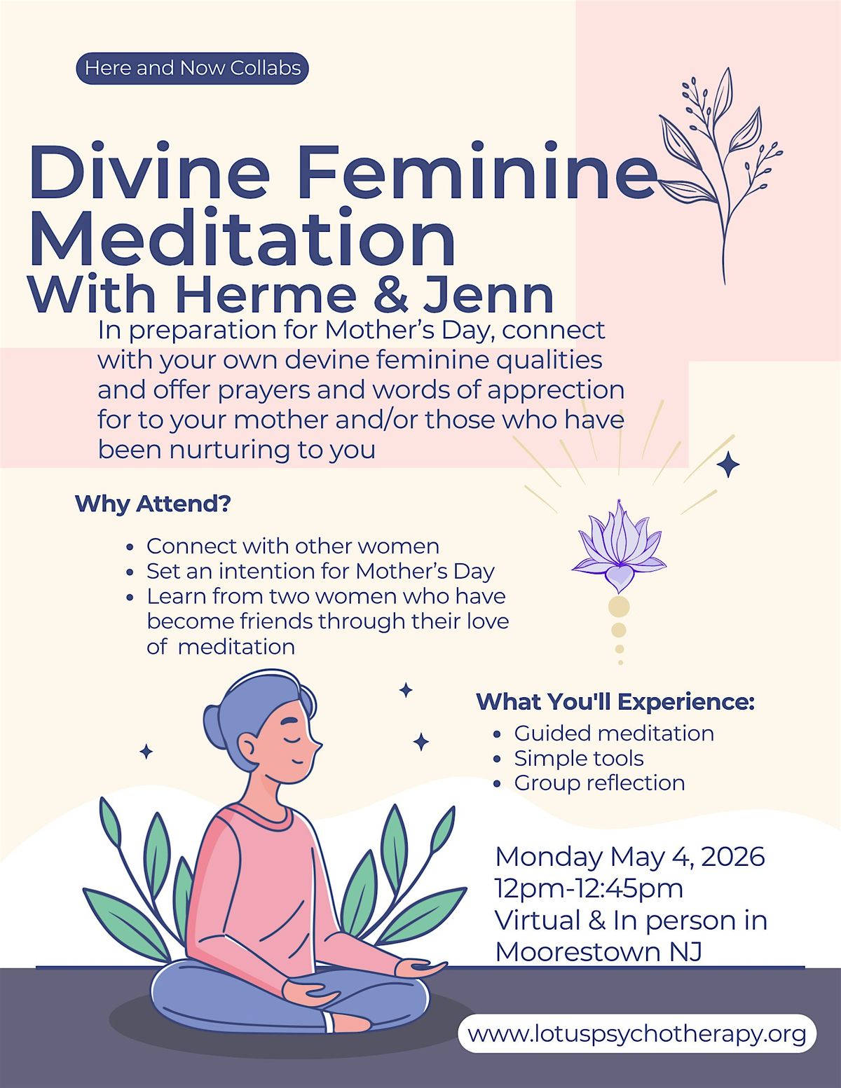 Take a moment to connect with your inner self and embrace the power of the divine feminine. This chill, in-person meditation session is happening at 400 N Church St on May 4, 2026 at 12:00 PM (Eastern Time). Whether you're new or experienced, come as you are and find some peace with like-minded souls.