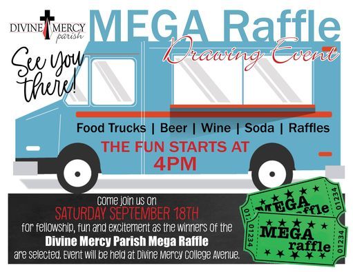 Join us for the Divine Mercy Mega Raffle Draw Party on Saturday, September 18 from 4-8pm at our 695 College Avenue loction. We will have Food Trucks, beverages, raffle baskets, and more! Our MEGA Raffle drawing beings at 6pm. Bring a lawn chair or blanket and join us for some food, fellowship and fun as we draw 250 winners, including our grand prize winner of $15,000! Get your tickets before you miss out!