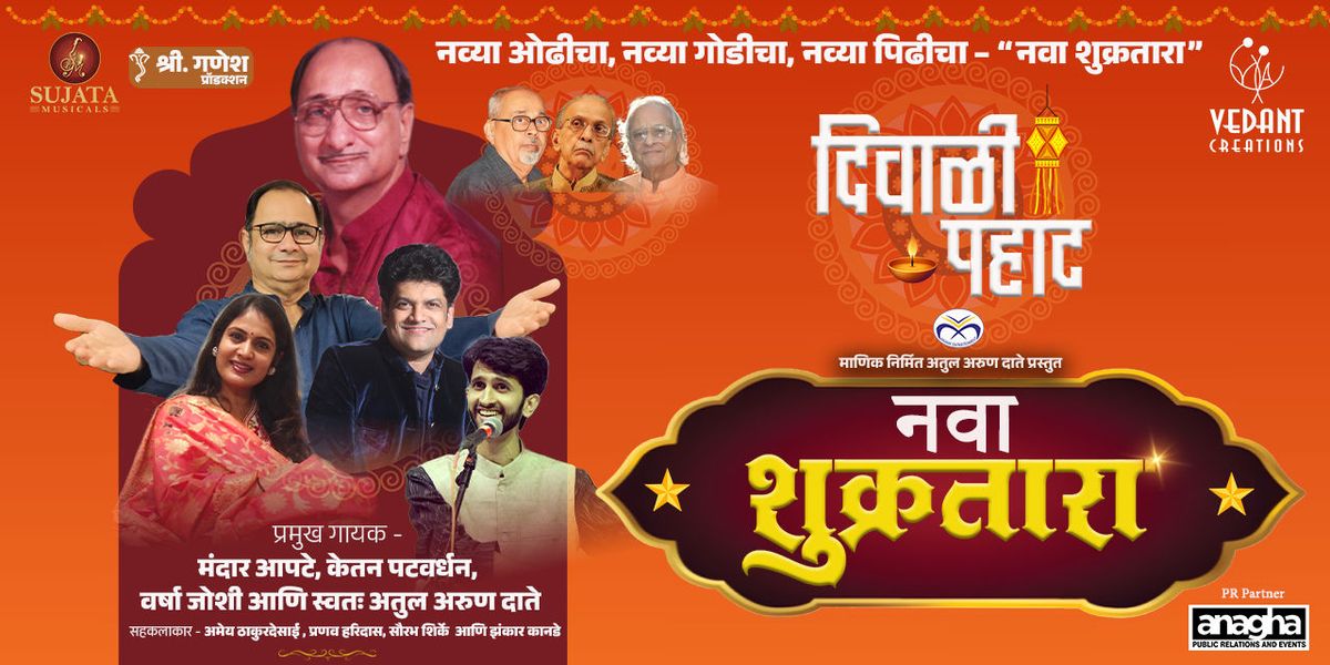 This Diwali, make your celebrations truly memorable with “Diwali Pahat – Nava Shukratara”, a soulful morning musical show dedicated to the timeless creations of legends like Arun Date, Mangesh Padgaonkar, Yashwant Dev, and Shrinivas Khale. Enchanting performances by Mandar Apte, Ketan Patwardhan, Varsha Joshi and Atul Arun Date will bring alive evergreen bhavageets such as Shukratara Mand Vara and Shatada Prem Karave, connecting generations through melody, poetry, and tradition. Begin the festival of lights with music that awakens the soul and celebrates the spirit of togetherness.