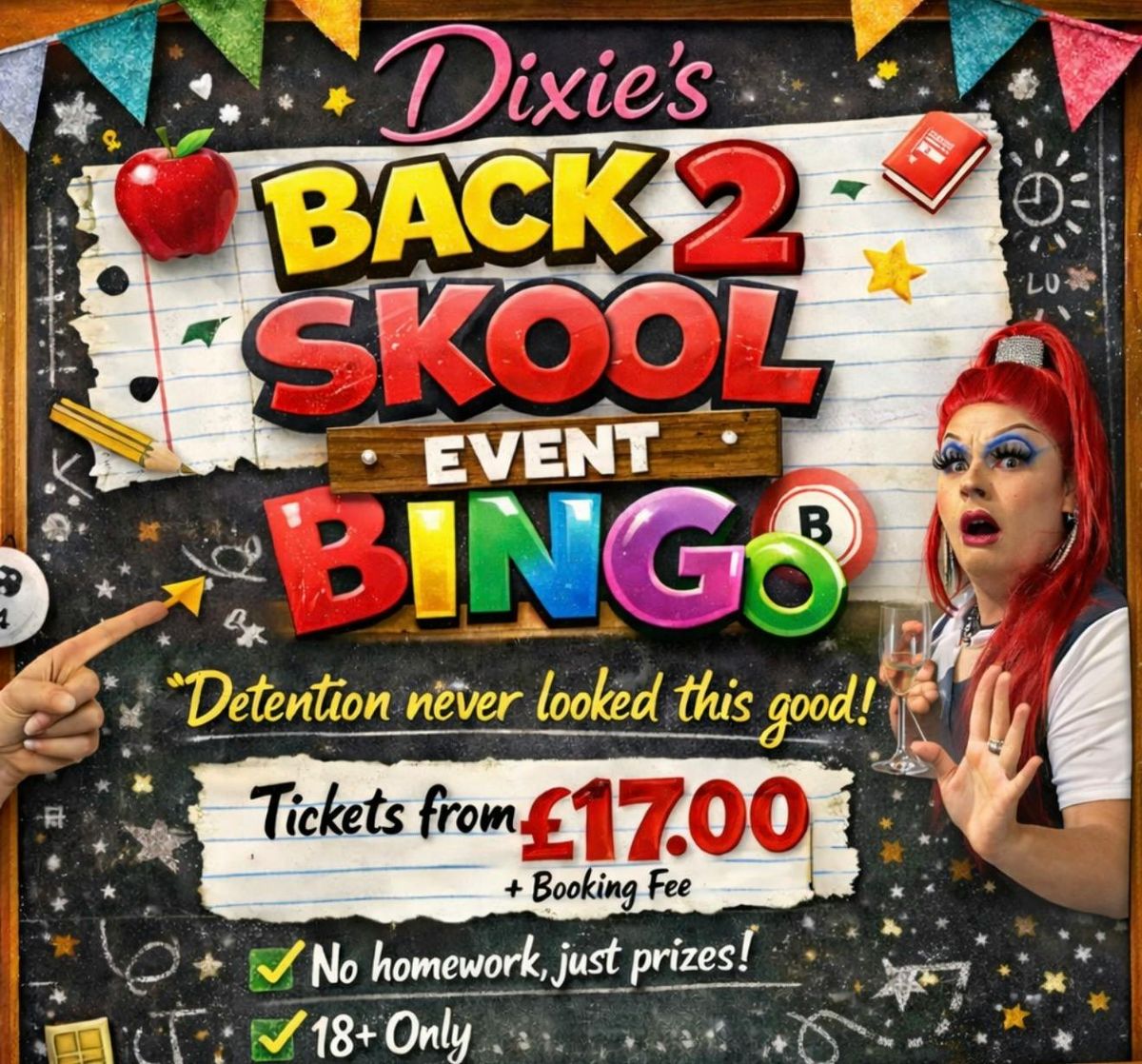 Join Dixie for a night of chaos, laughs, and bingo like you’ve never experienced before. Expect outrageous entertainment, big energy, and a room full of people ready to misbehave — all with a guaranteed £500 jackpot up for grabs 👀
