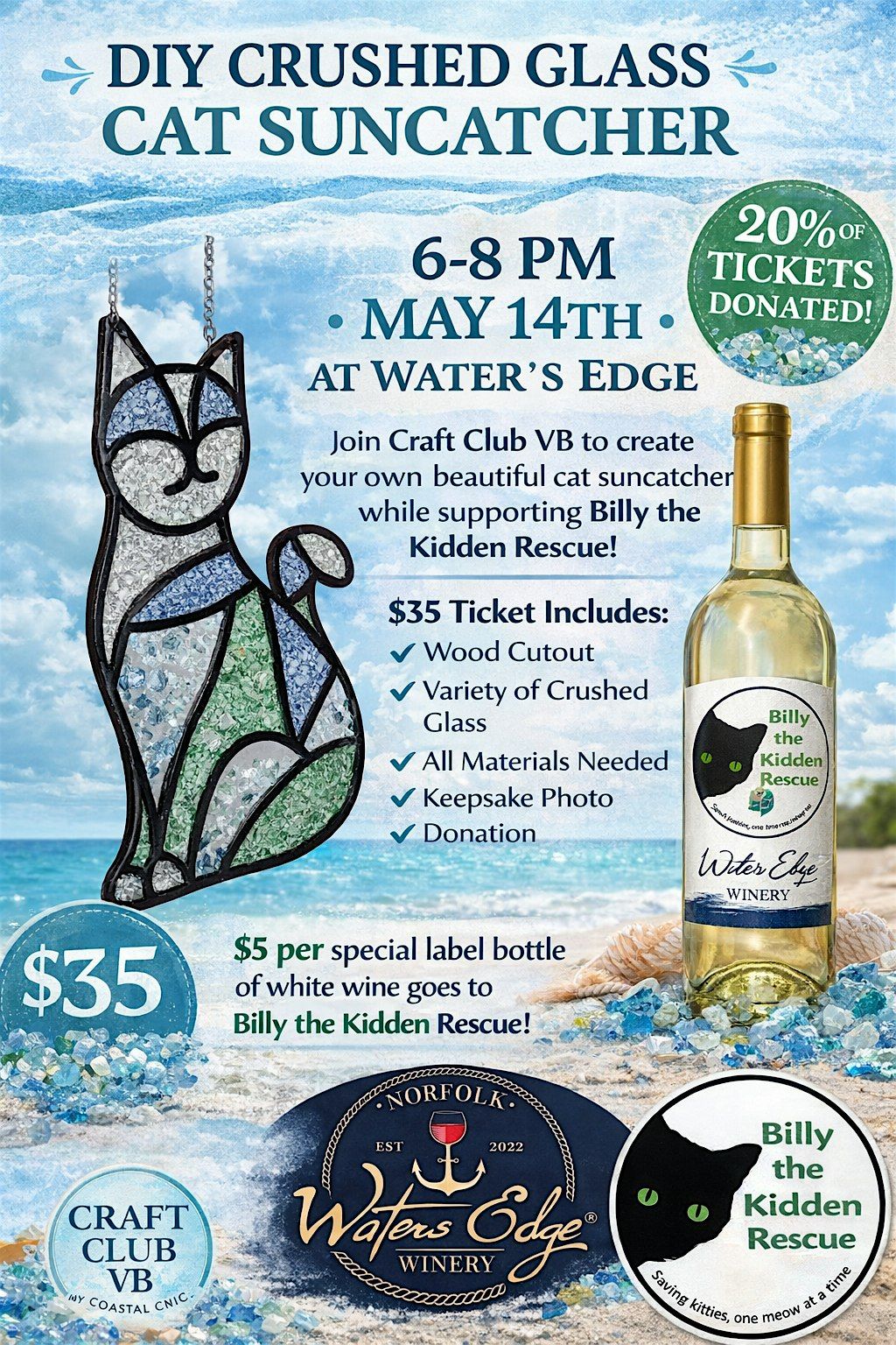 Join Craft Club VB for a fun and creative night while supporting a great cause! Create your own beautiful cat suncatcher using crushed glass — perfect for hanging in a sunny window.