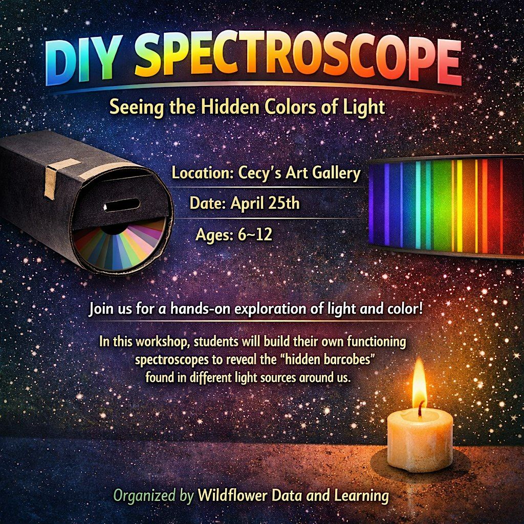 Join Wildflower Data and Learning for a hands-on workshop where children explore the science of light through building their own working spectroscope. Participants will learn how different light sources—such as sunlight, bulbs, and flames—contain unique “barcode” patterns, and will observe these spectra firsthand using a device they construct themselves.