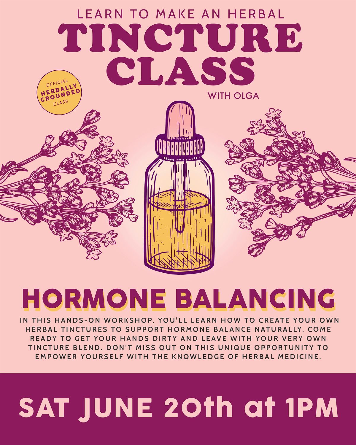 Welcome to our DIY Herbal Tincture Class - Hormone Balancing Edition! Join us on Sat june 20th at 1:00 PM at Herbally Grounded for a fun and informative session on creating your own herbal tinctures to help balance your hormones naturally.
