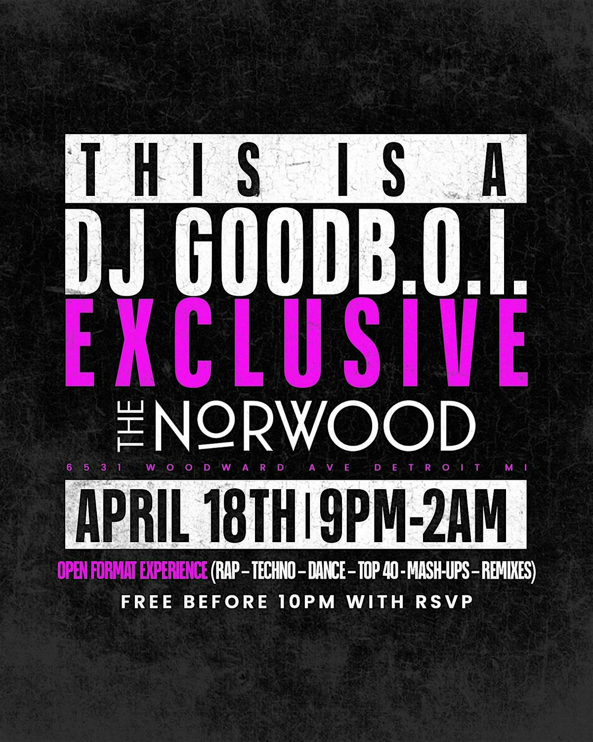 Saturday, April 18th, Dj GoodB.O.I. is bringing The Exclusive vibes to The Norwood!