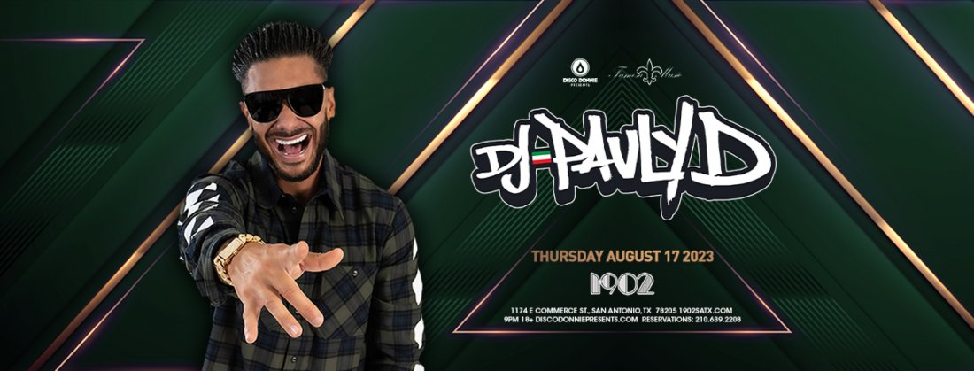 This sensational performance by Pauly D is proudly brought to you by 1902 San Antonio and Disco Donnie Presents. As San Antonio’s premier nightclub 1902 San Antonio delivers a Las Vegas-style entertainment experience like no other. For more information inquiries or reservations visit www.1902satx.com or contact the venue directly at 210-639-2208.
