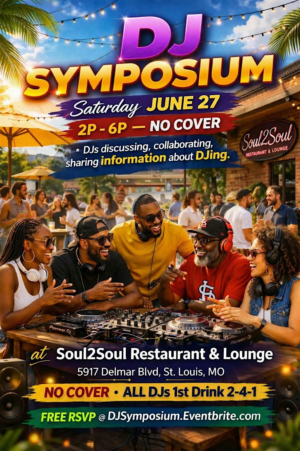 Join us for an epic in-person gathering where all things DJ come alive! Hosted by Dr BJtheDJ Saturday June 27, 2026 2pm - 6pm. ALL DJs 1st drink 2-4-1. Whether you spin on turntables or controllers this is the place for DJs to be. Pull up to connect, colaborate, share, and groove with fellow DJs from all musical eras and generes.