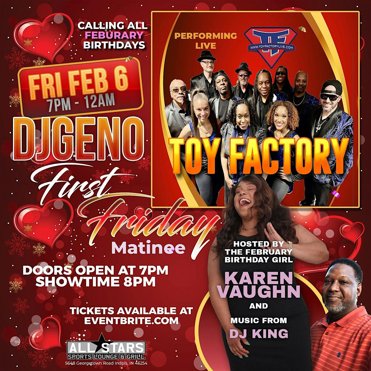 Dj Geno’s first Friday matinee at All-Stars celebrating February birthdays live performance from Toy Factory and host bday girl Karen Vaughn