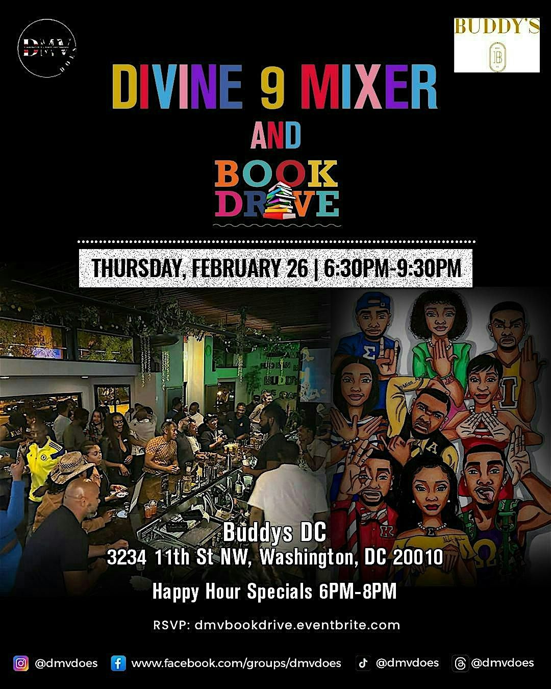 This social mixer brings together members and supporters of the Divine Nine and the broader DMV community for a night of great vibes, meaningful connections, and purpose-driven impact. Enjoy happy hour specials from 6–8 PM while mixing, mingling, and making a difference—one book and one connection at a time.