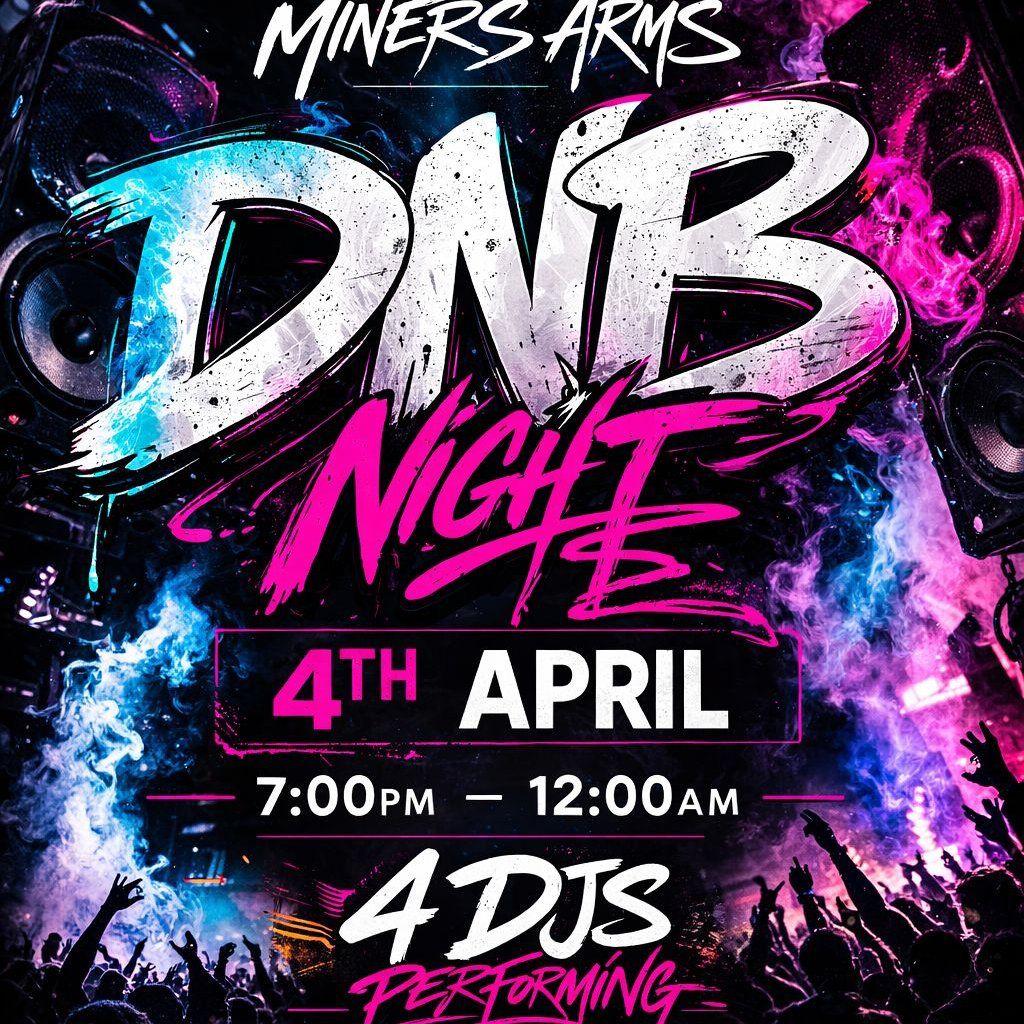 The Miners Arms welcome you to come and join us on Saturday 4th April for a drum and bass night! 4DJS, good music, lots of drinks from 7pm till 12