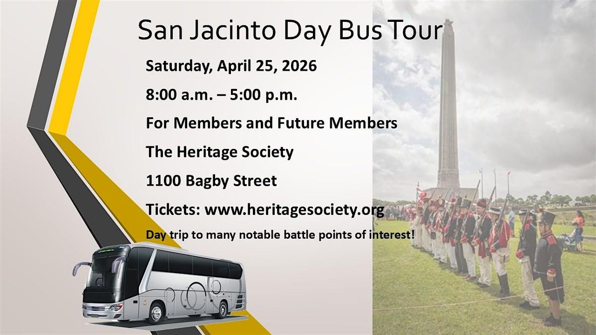 Honor San Jacinto Day with a full‑day historical immersion that traces the decisive moments leading to Texas independence. This guided bus tour follows the path of the Texian Army, visits key sites tied to the Battle of San Jacinto, and concludes with a celebratory return ride featuring champagne as we head back to The Heritage Society. Our Texian Tour Guide, Dr. Don Williams, has created an exclusive tour experience for members and future members.