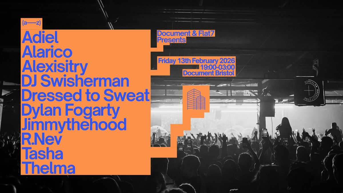 Flat 7, the crew behind Bristol's most uncompromising techno parties, bring their biggest event yet to Document on the 13th of February. Expect a heavyweight lineup featuring Adiel, Alarico, Tasha, DJ Swisherman, Dylan Fogarty, Thelma, plus a selection of Flat 7 favourites representing the sharp end of the Bristol scene.TICKETS ON SALE NOW!
