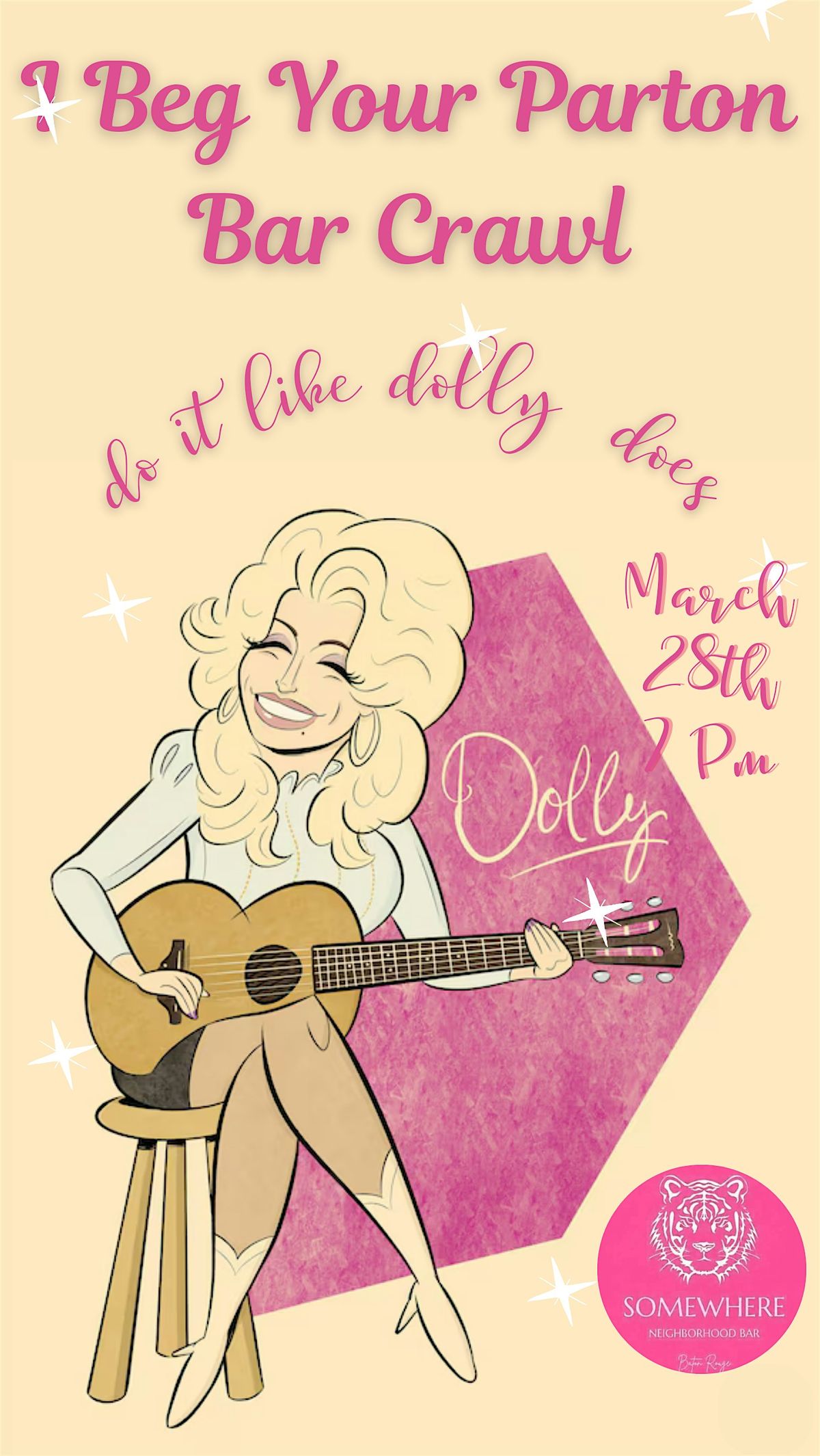 We are thrilled to host our 2nd Dolly Bar Crawl! Get ready to take over downtown dressed as the one and only Dolly Parton.Check-in will take place from 6:30 PM to 7:00 PM at Somewhere, where we will have photos and a welcome drink. From there, we will visit Danny’s Dive Bar, O'Hara's, and Squeaky Pete’s before finishing the night back at Somewhere with great music. We look forward to seeing you there!