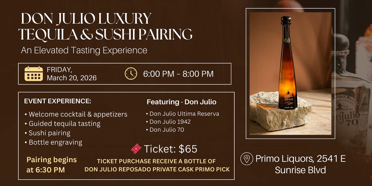 Join us at Primo Liquors for an exclusive Don Julio luxury tequila tasting and sushi pairing experience. This guided tasting event brings together premium tequila, expertly paired sushi, and a refined educational experience.