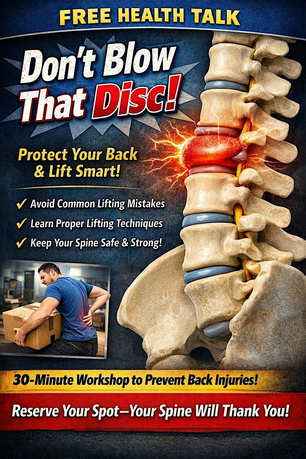 Join us for a fast-paced, 30-minute health talk designed to help you protect your spine and prevent avoidable back injuries. We’ll break down the most common lifting mistakes people make at home, at work, and in the gym—and teach you simple, practical strategies to keep your discs healthy and pain-free. Learn proper lifting mechanics, smart movement habits, and key prevention tips that can save you from months of discomfort. Your back does a lot for you—let’s make sure you return the favor.