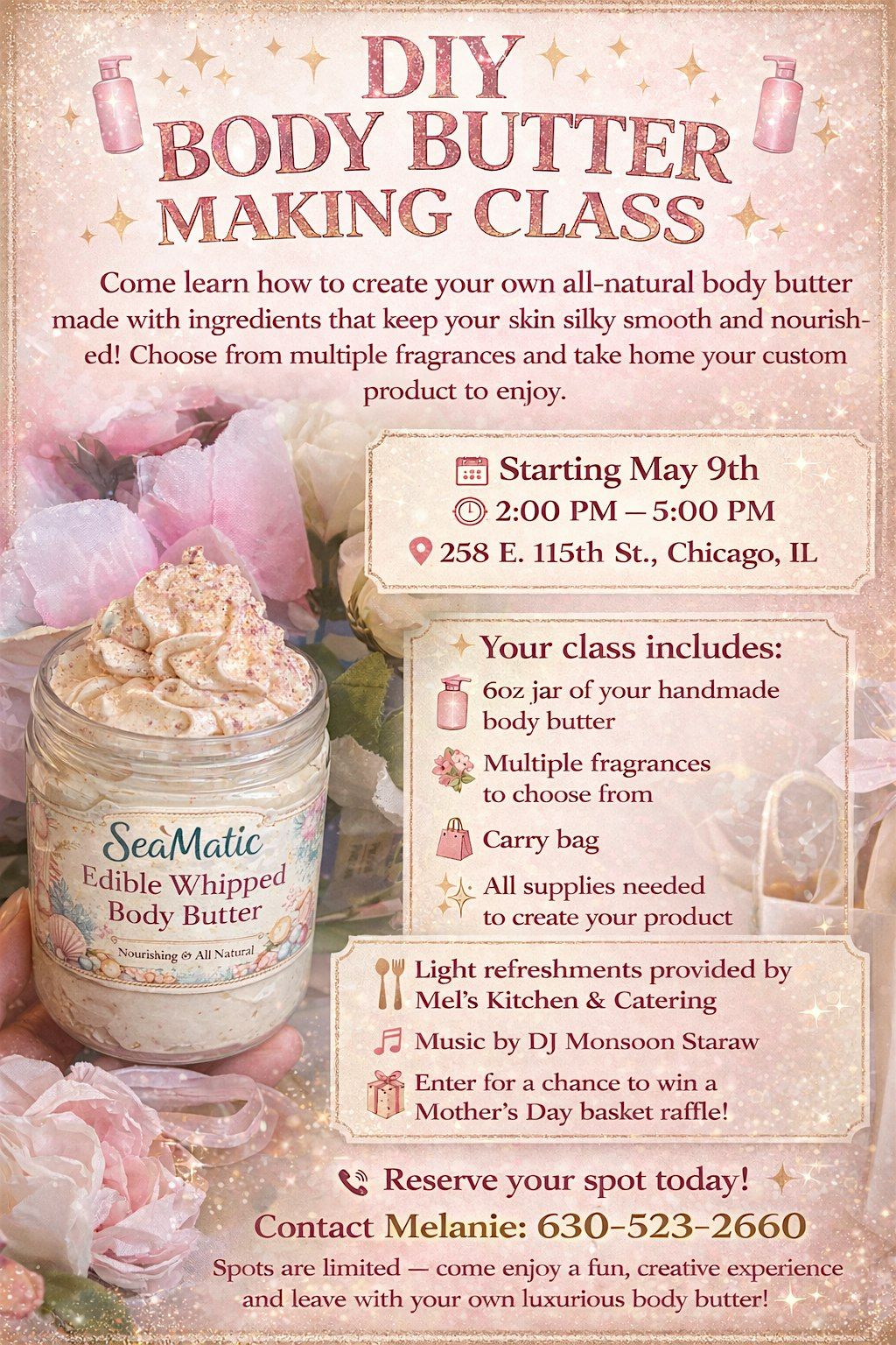 β¨π§΄ DIY BODY BUTTER MAKING CLASS π§΄β¨ Come learn how to create your own all-natural body butter made with ingredients that keep your skin silky smooth and nourished! Choose from multiple fragrances and take home your custom product to enjoy. π Starting May 9th β° 2:00 PM β 5:00 PM π 258 E. 115th St., Chicago, IL Your class includes: π§΄ 6oz jar of your handmade body butter πΈ Multiple fragrances to choose from π Carry bag β¨ All supplies needed to create your product π΄ Light refreshments provided by Melβs Kitchen & Catering πΆ Music by DJ Monsoon Staraw π Enter for a chance to win a Motherβs Day basket raffle! π Reserve your spot today! Contact Melanie: 630-523-2660 Spots are limited β come enjoy a fun, creative experience and leave with your own luxurious body butter! β¨