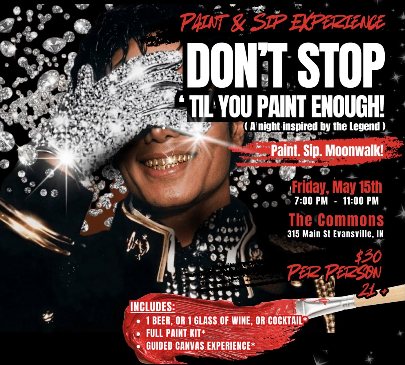 Join us for a high-energy night of music, art, and entertainment at The Commons in Evansville. Enjoy a guided canvas painting session while a live DJ plays iconic hits throughout the night. Your ticket includes one drink (beer, or a glass of wine, or a cocktail), a full paint kit, and an interactive experience featuring a moonwalk and best dressed competitions, themed cocktails, and more.