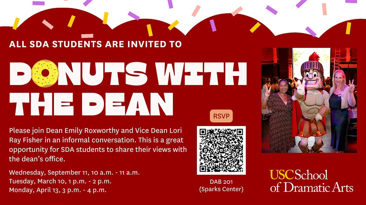 Join us for a delightful morning of donuts and conversation with our esteemed Dean! This in-person event will be held at the new Dick Wolf Drama Center (Room 201-The Sparks Center). Get ready to indulge in a variety of delicious donuts while getting to know the Dean and fellow students. It's a perfect opportunity to ask questions, share ideas, and connect with the academic community. Don't miss out on this exciting event - mark your calendars and bring your appetite!