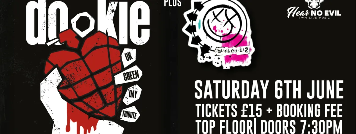 TWM Live presents Dookie, the UKβs longest running tribute to Green Day, returning for a 90-minute set of pure hits at Three Wise Monkeys, Colchester.Supporting is Blinked 182, playing all the classics.Date: 6 JuneVenue: Three Wise Monkeys, ColchesterTickets: Β£15Doors: 7:30pmAges: 18+Please note that access to the top floor of Three Wise Monkeys does not have a lift, but there are rest opportunities between each flight of stairs.Viewer discretion is advised: This show may potentially contain flashing and strobing lighting effects.Refund policy: We are unable to process any ticket refunds within 7 days of the event.